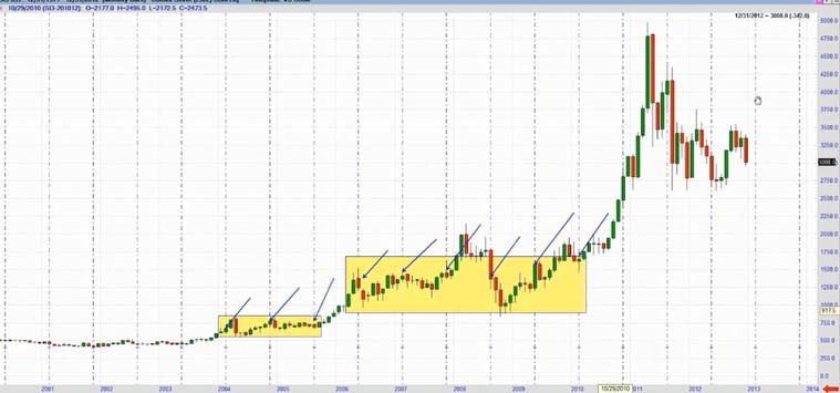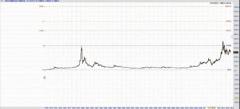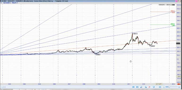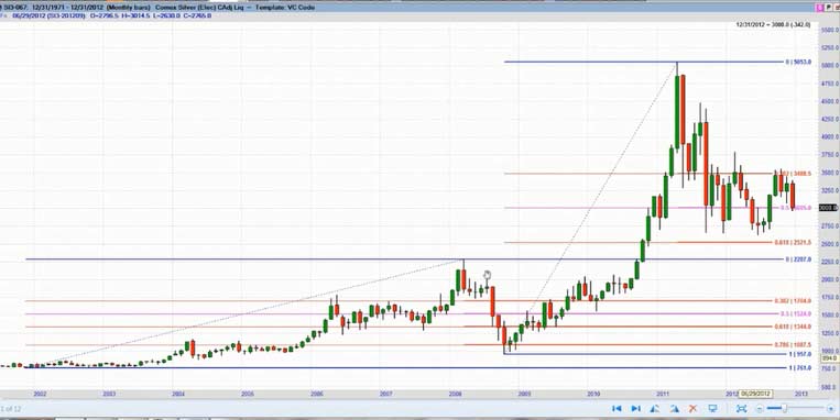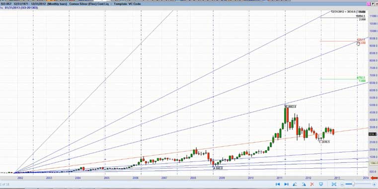 The minutes of the Federal Open Market Committee's December meeting "sucked all of the oxygen out of the room for gold bulls - and if not for the reversal in silver, I believe the sell-off in gold would be more pronounced," said Steve Roy, Chief Technical Analyst for Equity Management Academy. Gold's weakness was set off by Thursday's release of the minutes from the Fed's last meeting, which showed that several Fed officials thought the central bank would be able to slow or stop its bond purchases - a method of increasing monetary stimulus that goes beyond low interest rates - well before December 2013. Silver's slip Friday made its value at its cheapest compared to gold since late August, with 55.76 ounces of silver now equal to one ounce of gold, against 50.4 in early December. Gold's price falls may be due to profit taking by speculative players. Since December 20th, gold had risen from $1,638/oz to $1,694/oz or by 3.5%. It may also be the case that bullion banks with large concentrated short positions are using the pretext of the Federal Reserve minutes to manipulate the price lower - both to profit and to allow them to close out their significant short positions at more advantageous prices and possibly even go long. "Fed trying to suck and blow at the same time. This was an effort to bomb real assets. It will fail ," commented Eric Sprott from Sprott Asset Management on a phone interview. For the first time since the financial crisis started five years ago, the Federal Reserve has at last made its first signal that its extraordinary loose monetary policy will start to get tougher. But, the minutes show, the central bank is starting to say, enough is enough. Of the crowd that supported bond buys, a few say they should continue until the end of the year, and several said it could stop, or slow, well before then. Without any specific strategy or defined plan to replace Operation T wist moving forward and beyond the 2013 deadline, it seems very clear that the door is wide open to introduce QE4. What form it will take is anybody's guess. This will come on the face of a deeper problem as they try to negotiate the next round of the Budget Deficit ceiling and the U.S. Debt Crisis. In 2008, publicly held debt as a percentage of the economy ( GDP ) was 40.5 percent, nearly four points below the post-World War II average. Since then, the debt has increased by 45 percent. The President's FY 2013 budget would increase the debt to 76.5 percent by 2022, despite $2 trillion in tax hikes. In recent decades, Japanese governments have piled up debts worth some ???11 trillion ($14.6 trillion). This corresponds to 230 percent of annual gross domestic product, a debt level that is far higher than Greece's 165 percent. Domestic banks and insurers have purchased 95 percent of the country's sovereign debt using the savings deposits of the general population. Experts warn that this system cannot go on for much longer. Takatoshi Ito, an economics professor at the University of Tokyo, have calculated that even if the Japanese people invested all of their assets in sovereign bonds, it would only be enough to cover 12 years of state expenditures. One additional "potential risk," is the "amount of holdings of Japanese government bonds within the banking sector," as central bank chief Shirakawa politely notes. If long-term interest rates were to rise considerably, it could affect the stability of the sector. That, at the very latest, would mark the point at which the crisis could spill across Japan's borders. In Germany, financial institutions like Mitsubishi UFJ may not be widely known, but they are still internationally networked mega-institutions that have the potential to destabilize the entire finance community. As the publicly held debt grows , net interest payments will increase dramatically, even assuming that interest rates remain low. Under current projections, real net interest costs would more than double over the next decade. Conclusion It is very unlikely that current central leaders will make any long-term fundamental changes to reduce the risk currently transferred to the world bond markets by the reckless spending and printing of fiat currency. As history shows at least in the last 300 years, it does not work. As the sentiment and perception of wealth becomes more pronounced with the realization and loss of its currency purchasing power, inflation or even hyperinflation becomes a very real threat. Currently, this threat is greater due to the fact we are in a global economy. If we sneeze China gets a cold. With this historic potential for precious metals staring us in the face and the long-term secular bull market intact, I spoke at length with Steve Roy, Chief Technical Analyst for Equity Management Academy and discussed the profit potential for the silver market for 2013 and beyond. According to Steve Roy, where the focus is managing wealth, through education. This is his forecast for Silver prices for 2013 and beyond. This analysis uses proprietary indicators, Fibonacci cycles, W.D.Gann analysis, as well as wave analysis (not necessarily that of Elliott). First, we are looking at a monthly continuation chart going back to 1971. I have used the Fibonacci expansion tool using a low in 1971 to the high in 1980. The 1.618% expansion of that move is $66.26, the 200% expansion is $81.56, and the 2.618% expansion is $106.31. I will base the rest of this analysis from the low in November, 2001 at $7.61, here. In order to get a better look, I have added a 9 month cycle from the 2001 low, and it ends in February of 2013, and again in November. Notice how, for the most part, this cycle shows highs to highs, except when the market corrected or consolidated. In this chart, I have included the Gann fan connecting the first two major tops of the move off of the 2001 low. Isn't it amazing that the high in 2011 hit the 2x1 line and sold off? This is alerting ME to accelerating movement in the up trending move. N