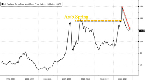 Even though the global food index has dropped a quarter since peaking in March 2022, the index remains just below levels responsible for anti-government protests, uprisings, and armed rebellions in the 2010 Arab Spring.