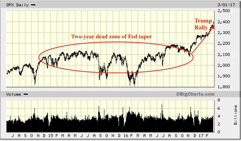 We saw the bull’s back break in a shocked response to Fed tapering that reverberated throughout 2015-2016, taking two big plunges and finally closing that period where it began. So, the market didn’t completely crash, but the bull lay half-dead on the ground for two full years! That’s big in itself. The Fed began tapering QE and then just slightly raising interest rates during that time—slightly—and the market got bounced around like a bull tied to the back of a freight train, but went nowhere: