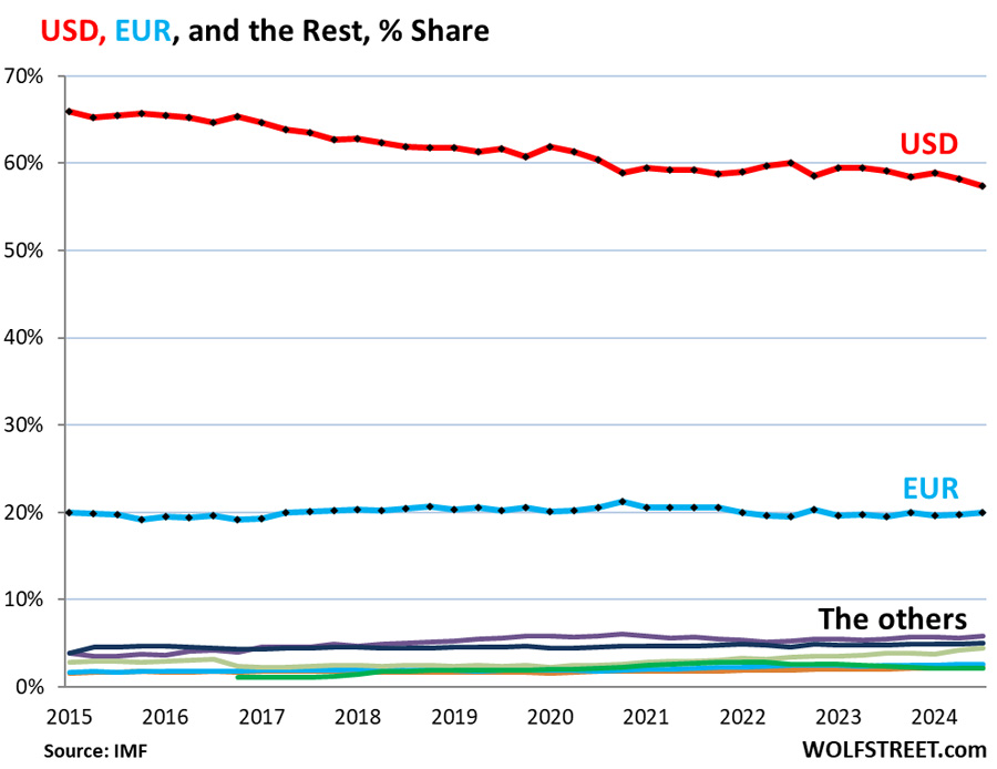 But by the 1990s, central banks loaded up on dollar-assets again, until the euro came along. This chart shows the dollar’s share at the end of each year (2024 = Q3).