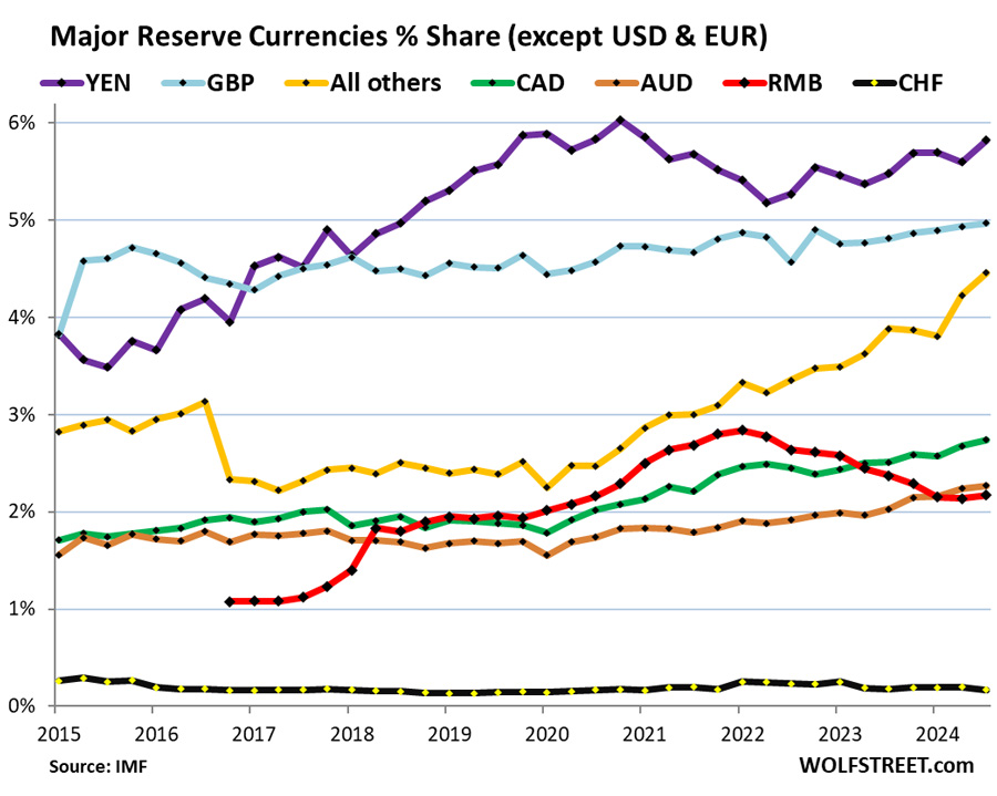 This includes the basket of “nontraditional reserve currencies,” as the IMF calls them, that are combined into “All others” (yellow in the chart below), whose combined share has been surging since 2020.