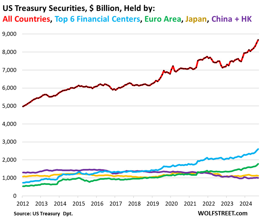 Holdings of US Treasury securities by foreign central banks and other foreign holders have surged from record to record. Over the past 12 months, foreign holders added $880 billion, bringing their stash to a record $8.67 trillion, according to the Treasury Department’s TIC data earlier (we discussed the details here).