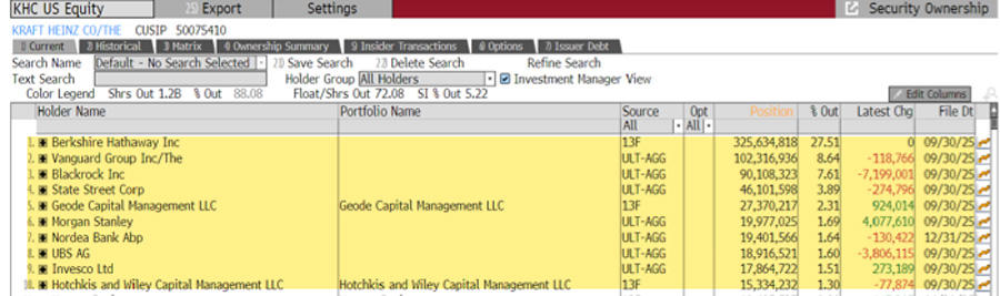 Berkshire, Vanguard, BlackRock, State Street, Geode Capital, Morgan Stanley, Nordea Bank, and UBS are the top shareholders of Kraft Heinz.