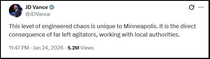 Last week CPB commander Greg Bovino was asked what makes Minneapolis different from other cities where ICE enforcement operations have taken place. Bovino noted in the Minneapolis region there is no separation between the extremists on the ground and the people in local government. Today, Vice President JD Vance concurs and expands on that sentiment:
