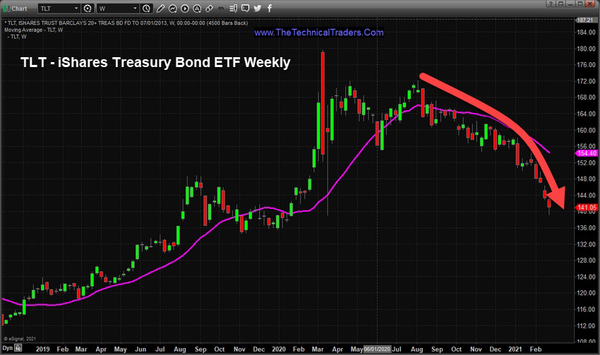 Falling Bonds and rising yields are creating a condition in the global markets where capital is shifting away from Technology, Communication Services and Discretionary stocks have suddenly fallen out of favor, and Financials, Energy, Real Estate, and Metals/Miners are gaining strength.  The rise in yields presents an opportunity for Banks and Lenders to profit from increased yield rates. In addition, historically low interest rates have pushed the Real Estate sector, including commodities towards new highs.