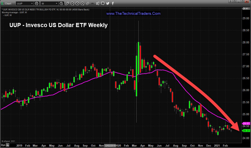 The Invesco US Dollar ETF, (UUP) Weekly below chart shows how weak the US Dollar has been after the COVID-19 price rotation.  The continued decline in price levels after May 2020 is a very clear indication that the US Dollar is reacting to the continued stimulus efforts as well as the decreased economic expectations.