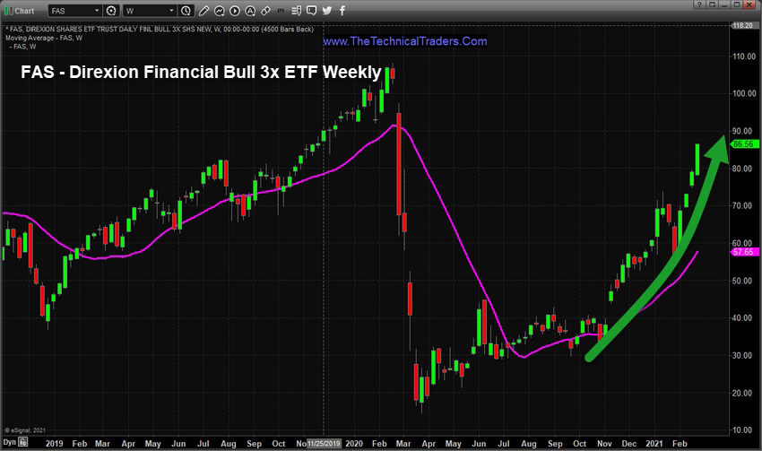 The following Direxion Financial Bull 3x ETF (FAS) Weekly chart shows the incredible advance in the Financial Sector over the past 6+ months.  Almost like a sleepy rally, Financials have been rallying while traders have been focused on Technology, Healthcare and other sectors that seemed hot.  This shifting trend in sectors, and the associated shifting capital, suggests we may be nearing a tidal shift in sector trends – moving away from Technology and into Financials, Energy, Real Estate, and others.