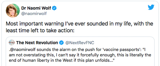 ‘How does China keep a billion people under the thumb of a totalitarian regime?’ Liberal author and feminist icon Naomi Wolf is warning that the proposed “vaccine passports” would mean the end of liberty in the free world. “I cannot say this forcefully enough: This is literally the end of human liberty in the West if this plan unfolds as planned,” she said in an interview Sunday with Fox News’ Steve Hilton.