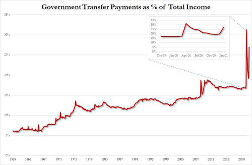 Goldman's conclusion is that while supply-chain and logistical challenges will persist and shipping costs will remain elevated until early 2022, putting upward pressure on the level of consumer prices through the end of this year, the bank believes that the impact on inflation has already peaked and will turn into an outright drag in 2022 as shipping bottlenecks resolve themselves and prices moderate. It is this fundamental assumption that none other than the Fed is also betting on; and while Goldman may be right and the supply side of the CPI equation may soon start to normalize and in fact be a drag on Y/Y prices in 2022, the bigger question is how much of an impact does the demand side have, a demand side where, as a reminder, the various stimulus checks have already more than offset all the lost income from the covid pandemic. And much more is coming. In other words, yes - if inflation was purely a supply phenomenon, Powell's avoidance of surging prices would be justified. But if the increasingly broader acceptance of Universal Basic Income in the form of weekly and monthly stimmies from the government makes handouts from the government, which now accounts for 27% of all consumer income...