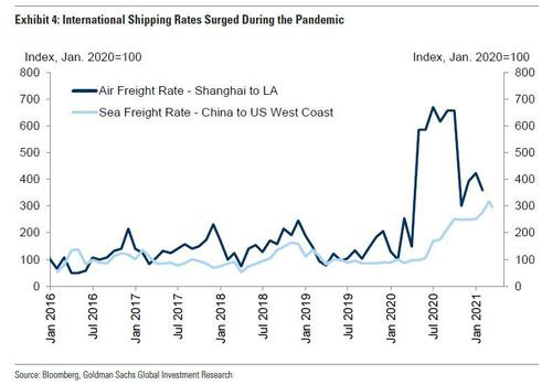 So first the bad news: even if the current burst of inflation is truly "transitory" - as the Fed vows, staking what little credibility it has that inflation will reverse in the second half of 2021 - Goldman concedes that "neither of the above two problems should abate soon" since fiscal support for household income should keep goods demand elevated and the virus should continue to disrupt the supply of international goods transport services until widespread inoculation in the US and its trade partners normalizes both goods demand and supply. But there is a silver lining: The good news is that because supply challenges are largely driven by transportation and not production constraints—unlike last spring when supplier delays spiked due to factory shutdowns that halted the supply of intermediate goods—Goldman, and by extension the Fed, expects that supply constraints will put upward pressure on prices but have less of an impact on real economic activity. As examples of how some importers and manufacturers have alleviated bottlenecks at higher costs, some companies have started importing bike parts and hot tubs by air rather than sea freight, and other producers have started rerouting imports through alternate ports. That said, these bottlenecks can lead to another perverse price increase as they substantially increase transport costs in strained trade routes. As shown in the next chart, shipping costs from China to the US have roughly tripled over the last year. This will likely put upward pressure on consumer prices as manufacturers pass these costs on to consumers.