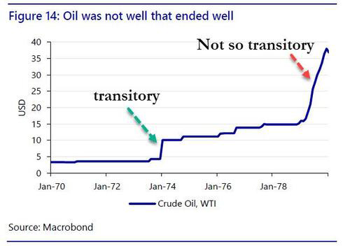 There is a big problem with that assumption: while FOMC members, most of whom are independently wealthy and can just charge their Fed card for any day to day purchases of "non-core" CPI basket items, the vast majority of the population does not have the luxury of having someone else pay for their purchases or looking beyond the current period of runaway inflation, which will certainly crush the purchasing power of the American consumer, especially once producers of intermediate goods start hiking prices even more and passing through inflation. Many readers may not recall, but one such instance of "transitory" inflation that proved to be anything but and led to the infamous Volcker Fed and its double digit rate hikes, was the price of oil which took off in the Arab oil embargo and then refused to come back for over a decade.
