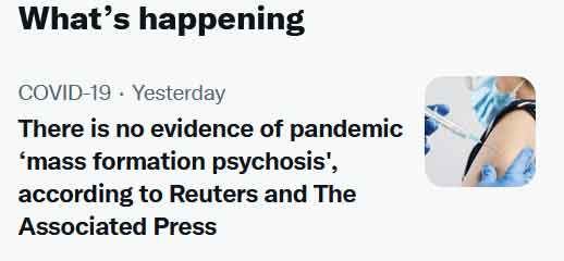 Australia, New Zealand, and numerous countries in Europe are already enforcing authoritarian measures and committing atrocities against their people using the power of the police state. Compliance and obedience are demanded by those pulling the strings, with explicit support of the indoctrinated 30%. This madness reveals itself in the glee proclaimed by the Covidian Cultists when an unvaxxed person dies from covid, when the unvaxxed are denied entrance to dining and entertainment venues, and when those who refuse the jab are fired from their jobs. These hypnotized non-thinking masked zombies refuse to break free from their religious like beliefs even as the narrative crumbles before their very eyes. Those in control of the crumbling narrative have been doubling down and producing bigger and bigger lies to keep the fear level at eleven. Cases at all-time highs and fear porn about children on ventilators is the latest tactic of the Faucites, even though omicron is no worse than the common cold and virtually no children are sick. The Covidian Cultists refuse to believe their worldview of sickness and death is based on a false narrative and continue to lash out at those refusing to go along with their delusional beliefs. The 40% in the persuadable middle, through most of this pandemic, have been heavily influenced by the Bernaysian propaganda campaign launched by the government, funded by Big Pharma, the Fed, and the taxpayers, and flogged unceasingly 24 hours per day on the boob tube with commercials, news reports, and interviews with paid off false prophets disguised as medical experts. The fear campaign was hugely successful, as demonstrated by the 62% fully vaxxed rate, indicating 32% of the persuadable 40% were scared into joining the brainwashed 30%. The strident, defiant, non-compliant 30% have unrelentingly continued to use facts and scientific data to counter the narrative and are on the verge of breaking the hypnosis of some in the brainwashed cohort and are clearly persuading many of the persuadables the vaccines don’t work, are dangerous and vaccine mandates are irrational and idiotic. This is borne out by the fact only 38% of those eligible for the boosters have chosen to get them. Many are realizing boosters are proof of vaccine failure. The tell on whether the forces of good are winning the battle is how the forces of evil are reacting through their control of the legacy and social media platforms. Whenever you see a fact check by the mainstream media outlets and proclaimed by Twitter as proof, you know they have circled the wagons to protect their false narrative. Dr. Malone and Joe Rogan struck a raw nerve, and this was at the top of my Twitter page this morning.
