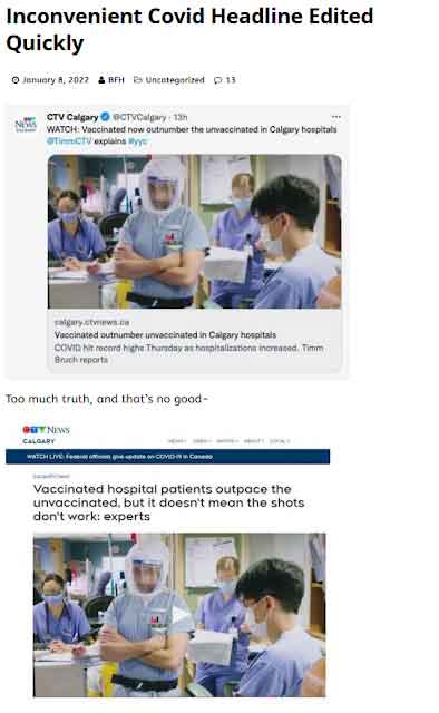 This unholy alliance of malevolence controls the narrative to such an extent through modern technological means, they can just erase history, accuse truth tellers of thoughtcrime, and suppress anything contrary to their fear narrative designed to drive the masses mad. Every media story must conform to the narrative or provide a caveat to the facts if they are inconvenient to the ruling class. If the truth accidentally slips through, you just edit the story and pretend the original story never existed. It is clear to any critical thinking person the vaxxes do not work as proclaimed by the highly compensated “experts” and their Big Pharma benefactors.