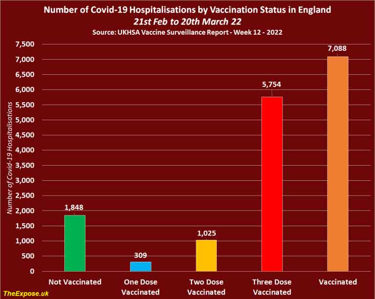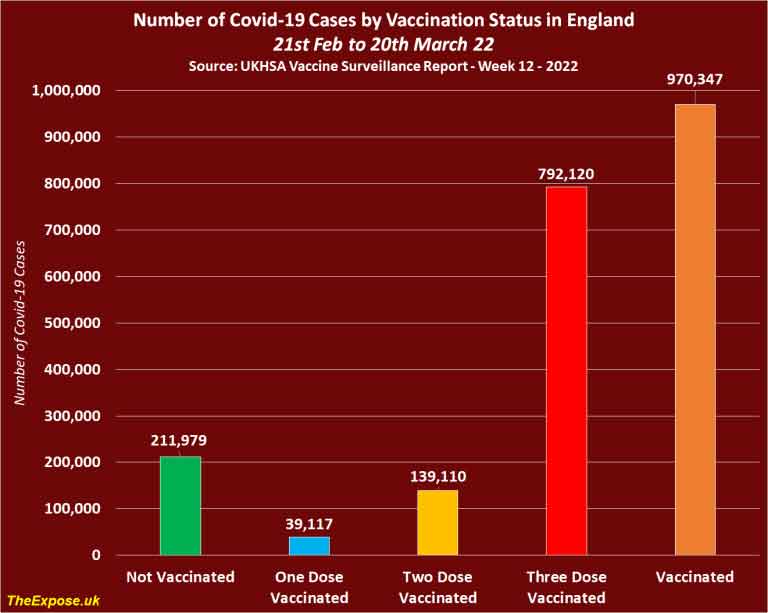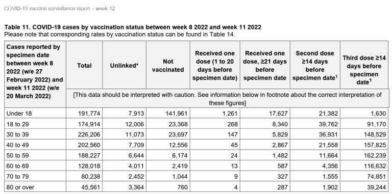You won’t hear about this extremely concerning data in the mainstream media because they’re too busy attempting to distract you with 24/7 propaganda on Russia’s invasion of Ukraine, repeats and condemnations of a man, Will Smith, slapping another man for disrespecting his wife, and telling you how the police are now going to issue fixed penalty notices to people in Downing Street for holding parties during lockdown. But they left out the part where it’s cost the tax payer thousands upon thousands of pounds for the Police to investigate this lunacy of course. So it’s left to us to make you aware that official data shows Covid-19 cases, hospitalisations, and deaths are again on the rise in England. But they’re not rising among the unvaccinated population, they’re only rising among the vaccinated, and it’s mainly the triple jabbed. The UK Health Security Agency (UKHSA) publishes a weekly Covid-19 Vaccine Surveillance Report containing data on Covid-19 cases, hospitalisations and deaths by vaccination status. The latest report, ‘Week 12′, was published Thursday 24th March and can be viewed here. Table 11, found on page 42 of the Week 12 – Vaccine Surveillance Report, contains data on Covid-19 cases by vaccination status between 21st Feb and 20th March 22, and it shows the triple vaccinated accounted for the majority of cases.