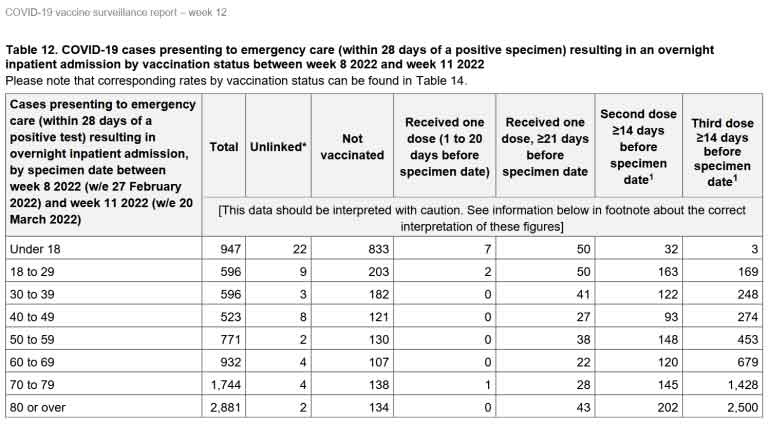 According to the report there were a total of 1,182,326 recorded cases over these four weeks, and a shocking 792,120 of them were among the triple jabbed, whilst just 211,979 cases were among the unvaccinated. But even then, 141,961 of those cases were among children. In all the vaccinated population accounted for 82% of all Covid-19 cases between 21st Feb and 20th March 22, 4 in every 5 of which were among the triple jabbed. While the unvaccinated population accounted for just 18% of cases. But it unfortunately gets even worse when it comes to hospitalisations. Table 12, found on page 43 of the Week 12 – Vaccine Surveillance Report, contains data on Covid-19 hospitalisations by vaccination status between 21st Feb and 20th March 22, and it again shows the triple vaccinated accounted for the vast majority.