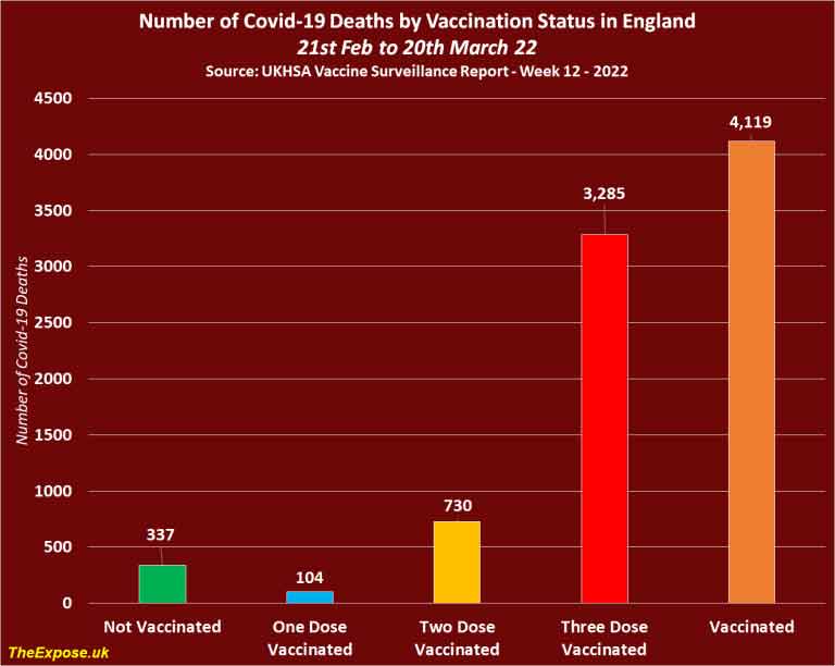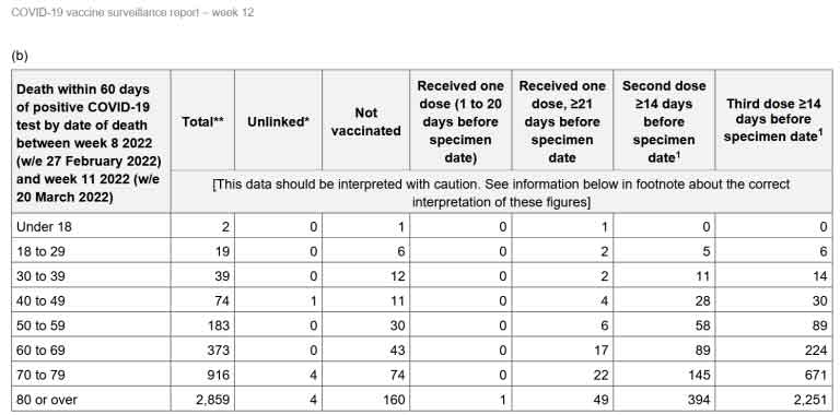 Table 13b, found on page 45 of the Week 12 – Vaccine Surveillance Report, contains data on Covid-19 deaths by vaccination status between 21st Feb and 20th March 22, and it shows the triple vaccinated accounted for the majority of them by a country mile.