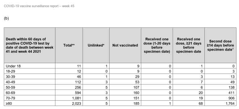 According to the report there were a total of 4,456 recorded deaths over these four weeks, and a concerning 4,119 of them were among the vaccinated, 3,285 of which were among the triple jabbed. Whilst just 337 deaths were recorded among the unvaccinated. This means vaccinated population accounted for a frightening 92.4% of all Covid-19 deaths between 21st Feb and 20th March 22, 4 in every 5 of which were among the triple jabbed. While the unvaccinated population accounted for just 7.6% of deaths. But this doesn’t make sense. The following table is taken from the Week 45 – Vaccine Surveillance Report, and it shows the number of Covid-19 deaths by vaccination status between week 41 and week 44 of 2021. This is the period just before Omicron was known to exist.