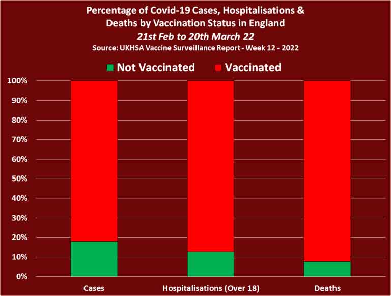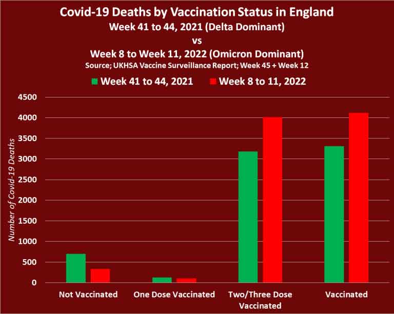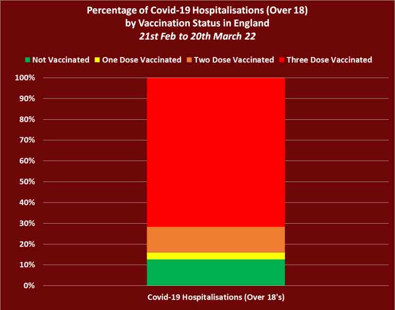 What this also shows is that the number of deaths occurring among the vaccinated population has increased by 25% now that Omicron is dominant and millions of had a third jab, compared to when Delta was dominant and millions had not had a third jab. Whilst the number of deaths occurring among the unvaccinated population has actually fallen by 52% now that Omicron is dominant, compared to when Delta, an allegedly much more severe variant was dominant. Can you see now why the latest data doesn’t make sense if you are under the impression the Covid-19 vaccines are actually effective? This data doesn’t just show that the jabs are ineffective, it shows that they actually make recipients worse. So there you have it, whilst you were distracted by Russia’s invasion, Will Smith’s slap, and lunacy policing on Downing Street parties, the UK Government published data confirming Covid-19 cases, hospitalisations and deaths are rising, and the triple vaccinated account for the vast majority of all of them.