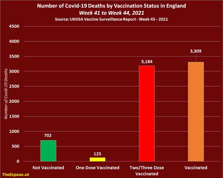 What we find here is that there were 4,011 deaths in those four weeks, meaning deaths right now due to Omicron are 10% higher than they were when Delta was dominant. But the most concerning find here is the distribution of deaths when Delta variant, compared to now where Omicron is variant and millions have been triple jabbed. Between week 41 and week 44, the vaccinated population accounted for 3,309 of the 4,011 Covid-19 deaths, meaning they accounted for 82% of Covid-19 deaths when Delta was dominant and the majority had not had a third jab. Whereas the unvaccinated accounted for 702 of the 4,011 Covid-19 deaths, meaning they accounted for 18% of Covid-19 deaths when Delta was dominant. 702 125 3,184 3,309