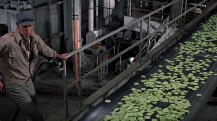 With not enough to eat, half of the world’s population is sustained only by a staple food source created and sold by the Soylent Corporation. It comes in various colors, the best of which is the titular Soylent Green. The company bills their new green variety as more nutritious, having been manufactured from oceanic plankton, but by the end we know the truth. Soylent Green is people!