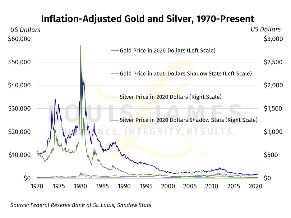 Back in 2020, Lobo Tiggre of the Independent Speculator did just that. He calculated historical precious metal prices, but adjusted for inflation using Shadowstats’ numbers. In the chart below, the Shadowstats-adjusted silver price is in green, and the Shadowstats-adjusted gold price is in blue.