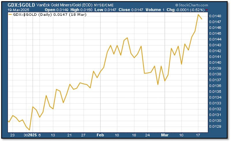 After a dizzying run to $3,000 that has stunned even the most ardent gold bulls, the yellow metal has continued to climb. Count me among the dumbfounded bulls. I stood in awe at how easily gold had achieved the latest millennium number, even as it was hesitating at $3,000. But since then, the run has continued, punctuated by a $34 jump yesterday even as other asset classes were diving. Today, gold gained once again in the wake of the Fed’s policy statement and during Chairman Powell’s press conference. The reason, I believe, is because there were no big surprises in anything from the Fed today. Thus, the rationale for higher gold prices remaining the same, and the uptrend quickly reset. That rationale is multi-faceted, ranging from recognition of the necessity to lower rates in the face of untenable debt service costs at current levels, the inflationary implications of the new tariff policies, and the increasing likelihood of a recession as the economic uncertainty works its way through the economy. More generally, I believe the tremendous rally we’ve seen in gold over the past two months, and even over the past year, is telling us something about the future. The markets are predictive mechanisms, and none are more sensitive than gold. Just as gold rose post-Covid as it discounted the eventual inflationary reaction to the Fed’s easy-money rescue efforts, it’s predicting something ahead today. That “something” is likely some combination of easier money and higher inflation. Being gold bugs and natural contrarians, a move like we’re seeing tends to set our Spidey senses tingling, wondering if gold is getting ahead of itself...and whether the market is about to slap us upside the head with a figurative 2 x 4. I’m comforted, however, by the fact that we’re starting to see Western investors coming into the metals and miners in force...and those money flows could soon increase substantially. Consider that gold has far outpaced every other asset class this quarter. Not only has the bloom come off the roses in tech equities, AI stocks, and Bitcoin — all of which have robbed gold of very significant speculative funds — but gold has risen relentlessly even as those assets have fallen. In the trend-following world of managed money, that outperformance is going to attract ever greater fund allocations like moths to a flame. The trend, already in place, will accelerate after first quarter reporting. The news will get even better for gold and silver stock investors, as the hot money will look for ways to leverage gold’s move...and they will discover that mining equities remain dramatically undervalued. It’s already happening to some extent, as the chart below of the GDX/gold ratio shows how mining stocks have been generally outperforming the metal since the beginning of the year. In short, investors have been aggressively moving into gold equities. This outperformance is especially remarkable when you consider how steeply gold has been rising. For mining stocks to do even better is quite something. There’s even better news for readers of our Gold Newsletter and Gold Newsletter Alert service, as the junior mining stocks in our portfolio are leading the charge upward. I’ve come up with a number of exciting new stock picks over the past few weeks, some of which are already taking off, while others remain on the launch pad. I cannot emphasize enough how special this opportunity is. The gold equities, and the juniors in particular, remain tremendously undervalued — especially with respect to where gold and silver are now trading. This is easily the most compelling market environment that I’ve seen in four decades in this sector. You should view my presentation at the recent Metals Investor Forum to see more details on why...but most importantly, you should click on the link below to subscribe to the Gold Newsletter or our alert service. Believe me, you’ll be kicking yourself if you miss this opportunity.