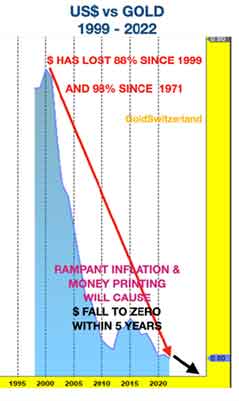 As the chart to the left shows, the dollar has lost 88% in real terms (gold) since 1999 and 98% since 1971 (not shown) The fall to ZERO is guaranteed since all currencies, without exception, have become extinct throughout history. But have we ever heard a central bank head or a president telling their people that the currency is going to become worthless due to their reckless actions? No, of course not. Firstly they don’t understand or study history and secondly no elected politician can ever tell the truth because if they did, they would never be elected. Just remember “Tricky Dick” Nixon: