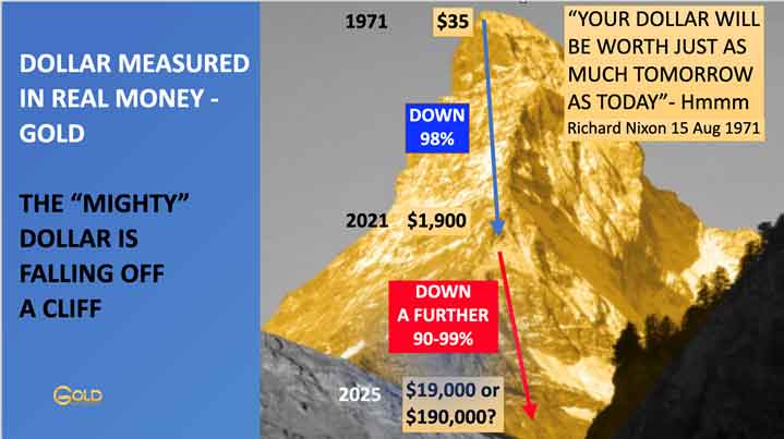 Clearly, Nixon had no understanding what happens to money when debt backs the currency rather than gold. Or did he just lie as he had the custom of doing? Regardless, he orchestrated a dollar fall (off the Matterhorn as illustrated above) of 98% with the remaining couple of percent loss down to a 100% happening in the next few years. Biden has with his current disastrous actions created the perfect climate for achieving the final 2% fall of the dollar. But remember that is a 100% fall from here. FREEZING ASSETS HAS CONSEQUENCES By demonstrating to world central banks that the US can freeze any country’s foreign exchange reserves held outside their country, the world financial system and central bankers have learnt a lesson that will permanently change the way they do business. No sane country will ever hold their reserves in US dollars or other currencies at a bank that the US government can directly or indirectly control. Nor will countries trust the Swift system which the US can unilaterally manipulate. The flight from the US dollar will not happen overnight but it will be more rapid than anyone can imagine. No judicious central bank chief will ever consider handing their forex reserves to the US, a bankrupt nation, with a collapsing currency which at a whim can confiscate other countries’ reserves. But not only that, who would ever put their money into US treasuries. Investors would not only lose their total investment on the falling value of the dollar but also on the US as a dodgy debtor which could easily default by debasing the currency to ZERO or extinguish the debt. Russia saw this coming already some years ago and thus liquidated all their US treasuries. Instead they wisely bought gold. US debt is now entering the Pass The Parcel Game with NO investor wanting to be left holding the parcel. Consequences our US friends, Consequences! Do you now see that your government has not just shot yourself in the foot but has inflicted your country with a lethal head wound. The collateral damage will clearly lead to a distrust not only in the US but in all governments and all currencies. Globalism is now turning into isolationism. AND THE OBVIOUS CONSEQUENCE OF THAT WILL BE A FLIGHT TO COMMODITIES AND ESPECIALLY PHYSICAL GOLD AND SILVER HELD IN A VERY SAFE PLACE.