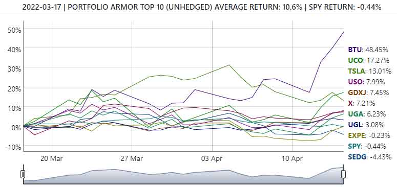 If you bought equal dollar amounts of each of our top ten names from March 17th, you were up 10.6%, while SPY was down fractionally over the same time period. As a reminder, we update our top ten names for subscribers each day the market is open on our website. If You Want To Stay In Touch You can follow Portfolio Armor on Twitter here, subscribe to our occasional email list here, subscribe to our YouTube channel here, or visit our website by clicking on the image below.