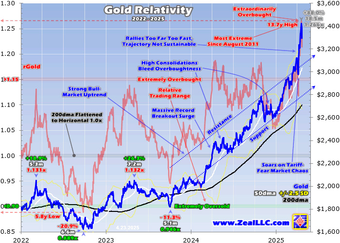 A year ago in mid-April, gold rocketed up to 1.188x its 200dma. I wrote an essay at the time about that extreme overboughtness, “warning of high risks for a sharp selloff. But even after rallying so far so fast, this powerful gold upleg still looks to have lots of room to run.” Gold hadn’t been that overbought since mid-August 2020, soon after its last 40%+ monster upleg peaked. So a rebalancing selloff was highly-probable. Gold indeed fell soon after, but merely by 4.0% which was just a minor pullback. Five weeks later in mid-May, gold had rebounded back to 1.178x its 200dma! This gold upleg was already so darned strong that it overcame upleg-slaying levels of overboughtness. Global central banks were the lead buyers, which aren’t price-sensitive. They had taken the helm from American stock investors and gold-futures speculators. Selloffs aren’t the only way to bleed overboughtness, which can be accomplished much more slowly with high consolidations. Such sideways drifts after big surges give time for traders to digest new higher prices, and baseline 200dmas to catch up a bit. Gold consolidated high last spring, moderating overboughtness back under that 1.15x+ extreme threshold. Then gold resumed surging heading into US elections. By late October gold had soared back up to 18.3% above its 200dma, again foraying deep into extreme-overbought territory. I wrote another essay heading into that warning about gold’s high selloff risk. That didn’t mean its bull run had to give up its ghost, but simply overextended technicals and sentiment needed some rebalancing. Gold did soon retreat, but that selloff only climaxed at an 8.0% pullback in mid-November. So it’s important to realize today’s monster gold upleg has already proven remarkably resilient to extreme overboughtness that has staked past uplegs! Again that’s because much of gold’s rally-fueling marginal demand has come from foreign buyers including central banks, Chinese investors, and Indian jewelry purchasers. If you need to get up to speed on that, my final essay in 2024 detailed gold’s remarkable year. With gold pretty much ignoring 1.188x and 1.183x overboughtness last year, it wasn’t too concerning when it surged back up to 1.186x relative on April 10th. It didn’t matter that gold closed at another new record $3,172, just how fast it got there. For reference at 1.188x in mid-April 2024 gold was at $2,388, then $2,786 at 1.183x in late October. But gold’s sharp surge in these last couple weeks really pushed limits. On April 11th, 16th, and 21st which was this Monday, gold blasted up 2.0%, 3.2%, and 3.0% hitting new record closes each day. Those $3,234, $3,334, and $3,421 closes stretched a whopping 20.8%, 23.9%, and 26.6% above gold’s 200dma! That latest 1.266x relative early this week was the most-overbought gold has been in fully 13.7 years! It was also above August 2020’s 1.260x which slayed gold’s last monster upleg. The more overbought any price gets, the greater the odds for an imminent big-and-fast selloff. Those are necessary to normalize both overextended technicals and excessive greed among traders. The risk of a sharper gold selloff is way higher 26.6% above its 200dma than it was at 18.8% or 18.3%. Traders have to realize that and prepare accordingly, girding themselves psychologically and protecting their capital. And this particular extreme-overboughtness bout is even riskier than it ought to be due to gold-trading dynamics. American gold-futures speculators dominate short-term gold price action, mainly because of the extreme leverage inherent in that realm. Now they are only required to put up $15,000 in cash for each 100-ounce gold-futures contract they trade, which controlled $329,400 worth of gold midweek! That equates to extreme maximum leverage of 22.0x, giving each dollar traded in gold futures up to 22x the gold-price impact of a dollar traded outright! Extreme leverage means extreme risks, so gold-futures specs can’t afford to be wrong for long. At 22x, a mere 4.5% gold move against their bets annihilates 100% of their capital risked! So they can only survive operating on myopic ultra-short-term time horizons. They can’t care how big today’s secular gold bull could grow, only about what gold will do in coming hours, days, or maybe weeks on the outside. These gold-futures guys usually watch the US Dollar Index for their primary trading cues, doing the opposite. The US dollar has fallen hard on global-trade-war fears over Trump’s big-tariffs gambit. The dollar plunging has helped fuel gold’s big up days in the last couple weeks. Gold has soared on five of them, averaging massive 2.9% daily gains! In four of those five starting on April 10th, the USDX has plunged averaging huge-for-it 1.2% daily losses. That has collapsed the rUSDX to just 0.940x, well into extreme-oversold territory. Way down at 94% of its 200dma, the dollar is due for a big-and-fast mean-reversion rally. That will likely unleash heavy gold-futures selling hammering gold. The massive foreign gold demand largely fueling this monster gold upleg could remain strong enough to force another high consolidation instead of a selloff. Gold may get lucky again like the first two times it hit extreme overboughtness in this powerful run. But make no mistake, the probabilities of a big-and-fast selloff are now higher by far than they’ve yet been in this upleg! My historical gold study confirmed that. Even soaring 88.0% at best in 18.5 months so far, today’s epic monster upleg or cyclical bull merely ranks as sixth out of all 42 of gold’s 10%+ moves higher since 1971. Not surprisingly the top four all came in the 1970s, with enormous 99%-to-128% gains over an average of just 5.9 months each! Coming off the US dollar’s gold standard was a unique time in history, not very comparable to today for countless reasons. Gold’s fifth-largest cyclical bull is much more relevant, a 92.3% monster over a leisurely 23.