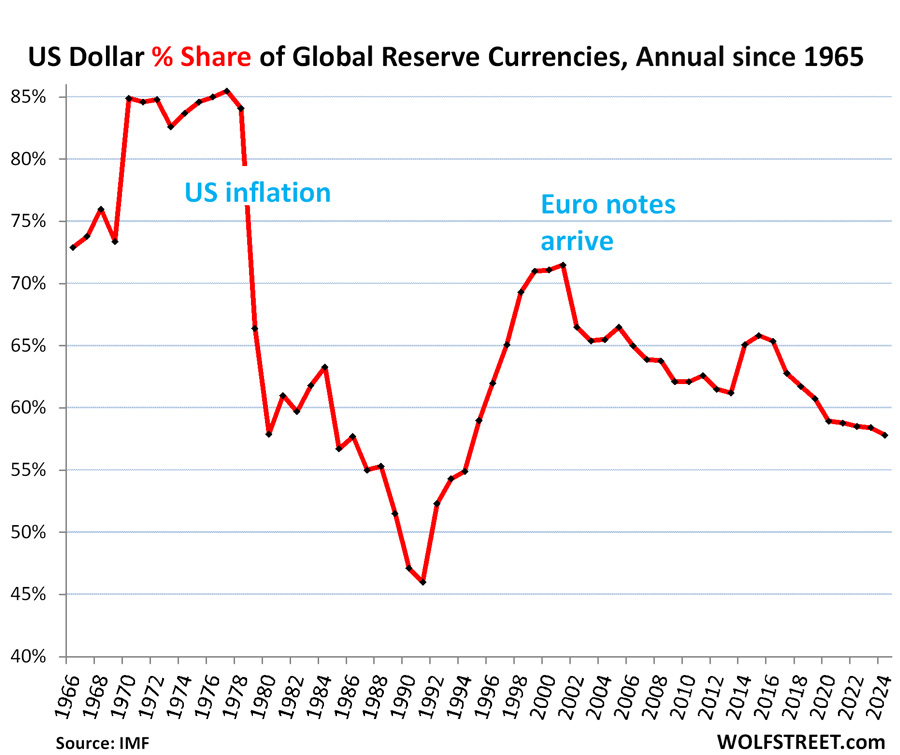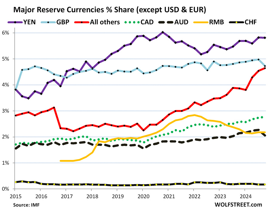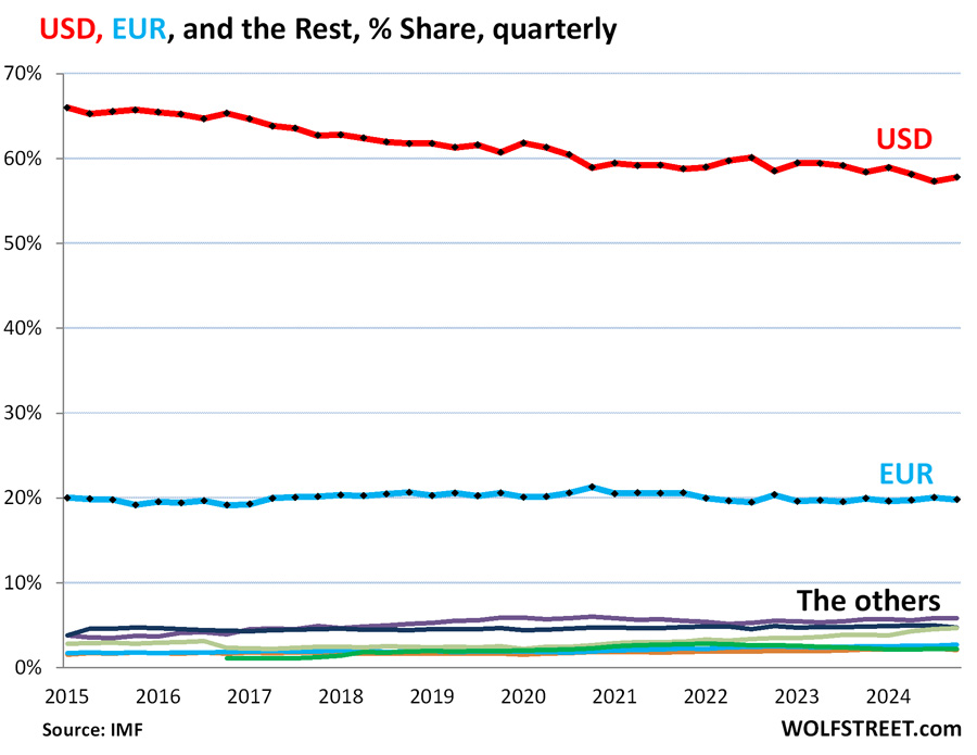 And the dollar’s share declined to 57.8% of total allocated exchange reserves at the end of 2024, the lowest since 1994, down by 7.3 percentage points in 10 years, as central banks have been diversifying their holdings for years to assets denominated in currencies other than the dollar, and into gold.