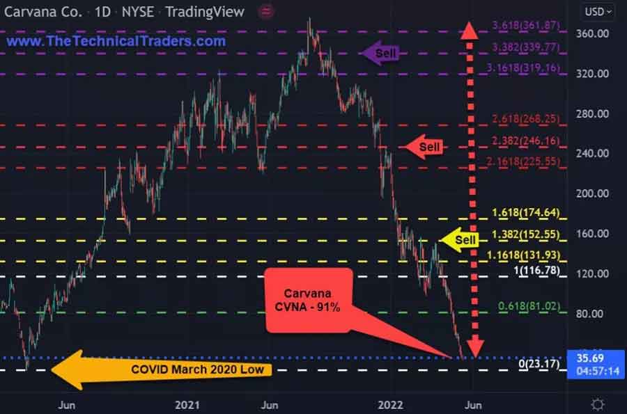 As professional traders, we spend a lot of resources determining whether we are in a bull-up market or a bear-down market. The follow-up to this is our additional efforts in finding the right places to buy or sell in either of these scenarios. As traders, we also have different styles or time frames that we trade. For instance, longer-term trend traders may utilize the daily, weekly, or even monthly charts. In comparison, shorter-term swing traders may utilize the 4-hour or 1-hour charts. Much emphasis and resources are committed to these efforts. However, we have learned that going to cash or having a cash position is just as important, if not more important, than having an actual position in the market. The beautiful thing about trading is that the trader is in control. We do our research, and then after weighing the evidence, we have the edge in that we have complete flexibility in determining whether we buy, sell, or do nothing. CASH POSITION VS INVESTED IN THE MARKETS Taking a position and making +20, +30, or +40% is great. But going to cash and avoiding a -20, -30, or -40% drawdown is just as important. We could even say that having the ability to go to cash is even more important as it protects our attitude and our health. There is nothing enjoyable about worrying about a position 24-hours a day, 7-days a week. A trader should ask themselves: Is holding onto this position worth the stress and worry about whether the market is going to rally; or will the market give me back a small portion of my hard money losses; or will the bottom completely fall out of the market which will destroy my account? Age is a defining factor in answering this question. Depending on our age, do we have the time or the energy to make back losses if the unthinkable happens? Successful traders have learned the hard way that retreating (going to cash) may be the best option as you live to fight another day. CARVANA -91%Carvana CVNA NYSE is the perfect example of the bottom falling out unexpectedly. The rallies were short-lived, ranging from 4-to 14 days. After CVNA had dropped about -25%, it only rallied back about 14-days before it started a steep but steady decline. CVNA is a textbook example of the importance of accepting a loss and going to cash. As technical traders, we exclusively follow price. This too is an important concept to grasp. Following and trading price simply means that the market tells the trader what to do and not the other way around. Being one with price will deposit money into your trading account. Fighting price will withdraw money out of your trading account. The market (or price) does not care what a trader’s opinion or bias is. Managing and protecting our hard-earned capital is our individual responsibility and should be the top priority. CARVANA CO. • CVNA • NYSE • DAILY