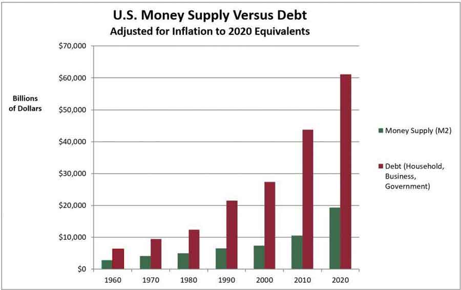 It’s time to think outside the box for some new solutions. In ancient Mesopotamia, it was called a Jubilee. When debts at interest grew too high to be repaid, the slate was wiped clean. Debts were forgiven, the debtors’ prisons were opened, and the serfs returned to work their plots of land. This could be done because the king was the representative of the gods who were said to own the land, and thus was the creditor to whom the debts were owed. The same policy was advocated in the Book of Leviticus, though it is unclear to what extent this biblical Jubilee was implemented. That sort of across-the-board debt forgiveness can’t be done today because most of the creditors are private lenders. Banks, landlords and pension fund investors would go bankrupt if their contractual rights to repayment were simply wiped out. But we do have a serious debt problem, and it is largely structural. Governments have delegated the power to create money to private banks, which create most of the circulating money supply as debt at interest. They create the principal but not the interest, so more money must be repaid than was created in the original loan. Debt thus grows faster than the money supply, as seen in the chart from WorkableEconomics.com below. Debt grows until it cannot be repaid, when the board is cleared by some form of market crash such as the 2008 financial crisis, typically widening the wealth gap on the way down.