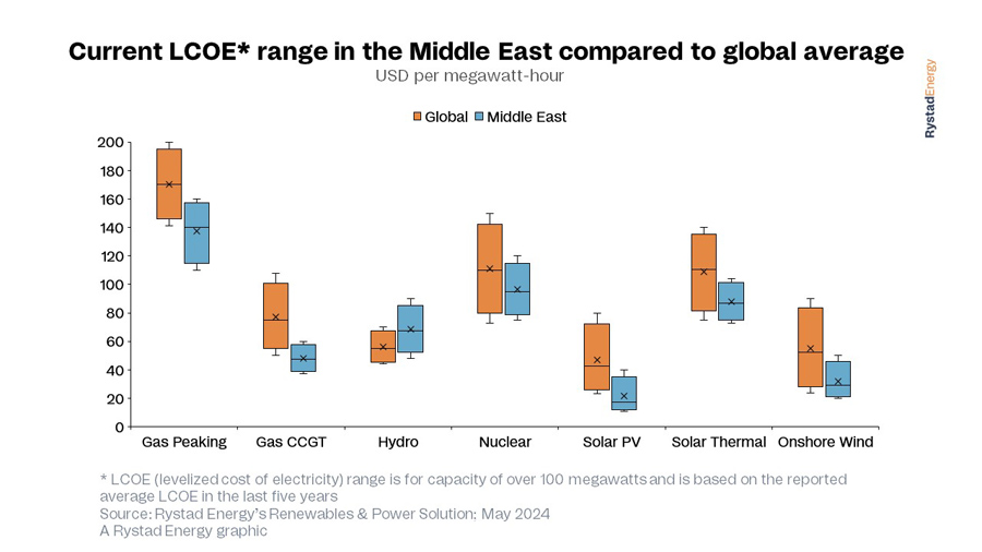 Solar energy is becoming increasingly important in the energy policies of Middle Eastern countries. As the cheapest energy source, solar PV in Saudi Arabia is at a world record-low levelized cost of electricity (LCOE) – an economic metric to assess and compare lifetime costs of generating power across different energy sources – of $10.4 per megawatt-hour (MWh). This is due to factors such as low hurdle rates, large-scale projects, declining hardware prices, low labor costs, and high solar irradiance. In fact, the region has exceptional solar energy potential, receiving more than 2,000 kilowatt-hours (kWh) per square meter annually in solar irradiation in countries such as Saudi Arabia, the UAE, and Oman.