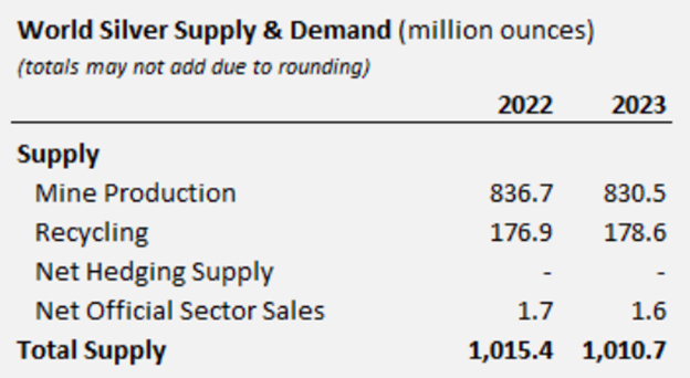 If you’re unclear of the math, each COMEX silver contract is alleged to represent 5,000 ounces of silver. As such, the total volume last Friday of 169,885 contracts equates to 849,425,000 ounces trading hands. As you can see below, The Silver Institute estimated total global mine supply for 2022 and 2023 to be around 830,000,000 ounces.