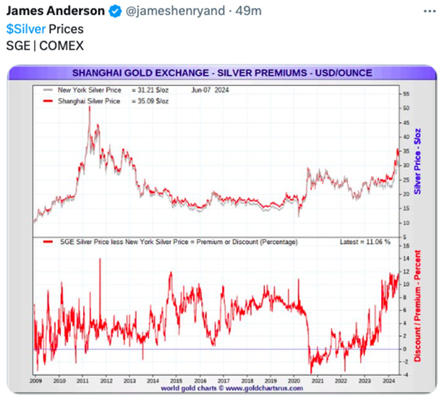 But it’s more than just that. The Chinese markets were closed on Monday, June 10, for observance of their Dragon Boat holiday. Once they reopen on Tuesday, June 11, how will prices respond to the beating they’ve taken since trading concluded early last Friday? We saw a massive selloff in the “paper” markets of London and New York, with COMEX silver trading volume last Friday nearing 100% of the total global annual mine supply.
