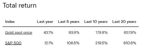 …and the S&P 500, which gold (as per curvo.eu) has outperformed for the last 20 years at both an annualized and total return basis: