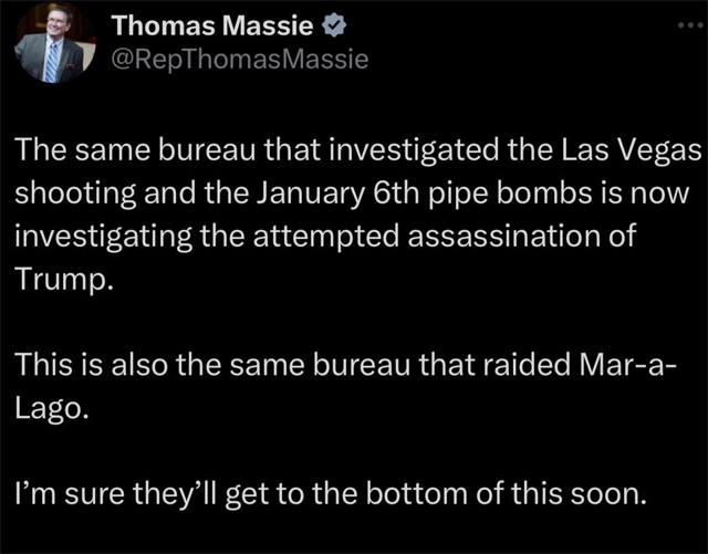 Here’s some more consolation: The New York Times reports this morning that the FBI is looking into the attempt on Mr. Trump’s life as “possible domestic terrorism.” One must ask: are they trying to shed new light on this event, or just blowing more smoke up America’s ass — because that has been the FBI’s specialty for at least the past eight years. We’ll know if they take the definitive step of labeling the act a “hate crime.”
