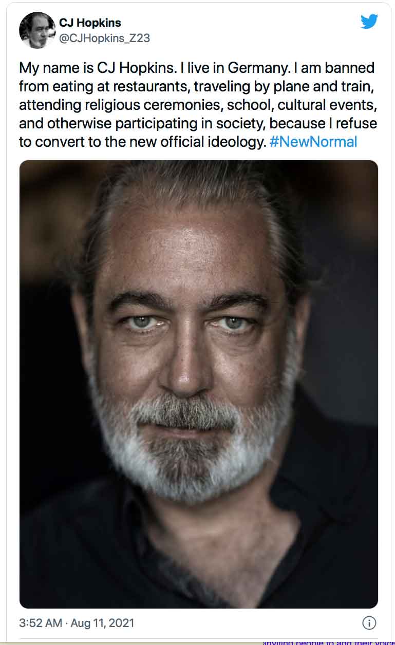 I think the young people call this a “meme.” It is something everyone can do. Make a tweet or a post like this, with your name, face, country, and details, whatever restrictions apply to you. Use the hashtag. Circulate it. Encourage others to do the same. Don’t even mention the virus or the “vaccines.” Focus on the totalitarianism. Make it visible. Make it personal. We need the New Normals to see the faces of the people they are demonizing because we won’t convert to their new “reality.” No, it will not make the slightest difference to the fanatics, but most of them are not fanatics. Most of them are simply scared and confused, and utterly mindfucked … as in their brains are not working. Literally. They are no longer able to think. Challenge them, and they will either become aggressive or start robotically repeating propaganda at you like the members of an enormous cult. Anyone who has interacted with them (and I have a feeling that you probably have) knows that they are totally unreachable with facts, argumentation, and basic reasoning, not to mention common sense, which is why I have mostly given up on that and am focusing on propaganda. Propaganda programmed these people, and propaganda can deprogram them … or at least it can interfere with their current programming, even if just for a fleeting moment, maybe even enough to start them thinking, which might lead them to questioning the official “reality” … which, as any cult deprogrammer will tell you, is the first step toward disengaging from the cult. Yes, it is just a picture and some words, but, if you doubt the power of visual propaganda, consider what GloboCap has achieved in the relatively short span of 17 months. They have imposed a new official ideology (in other words, a new “reality”) on societies all across the world. Seriously, think about that for a moment … they have literally implemented a new global “reality.” They have done this primarily with propaganda, much of it visual propaganda, which functions on a primal, instinctual level. They inundated the public with images of disease, hospitals, patients on ventilators, body bags being stacked in death trucks, mass burials, and people dropping dead in the streets. They forced everyone to wear medical-looking masks and to perform an ever-changing series of pointless, paranoid compliance rituals to generate an atmosphere of “deadly contagion.” Basically, they transformed the entire planet into an inescapable pandemic-theater production in which the terrorized performers are also the audience. They did this mostly with visual propaganda, images and observed behavior. (The nonsense the New Normals robotically recite at us isn’t meant to believed; it is meant to be memorized and repeated verbatim, like religious dogma, or a customer-service-representative’s script.) And, if you think your tweet or post doesn’t matter … well, it’s now a week since I posted mine, and thousands of people all over the world are joining in with tweets and posts of their own. (OffGuardian is collecting some of them here and inviting people to add their voices.) Twitter is suppressing the #NewNormal hashtag and slapping “sensitive content” warnings on the tweets. Fanatical New Normals, furious at being shown the faces of the people they are demonizing, are shrieking insults, death wishes, threats, mockery, and other vitriolic abuse at us, and demanding that the authorities censor us, and desperately attempting to disappear us by adding the hashtag to random gibberish. That wouldn’t be happening if our voices didn’t matter. What we’re doing is basically an online version of classic non-violent civil disobedience. We are disrupting the new official narrative, the official ideology, the official “reality,” even if just marginally, and just for a moment. Join in. Ignore the fanatical New Normals shrieking hatred at us on the Internet. Interrupt the “pandemic-theater” performance. Make the new totalitarianism visible. Make it personal … for them, and for us. If you need a reminder of what the stakes are, here is a recent photo of some lovely graffiti from an unknown location somewhere in New Normal Germany. For those of you who don’t read German, it translates as … “GAS THE UNVACCINATED.”