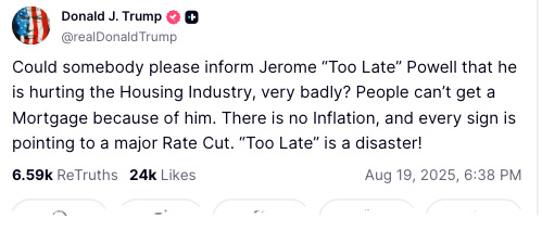 Meanwhile, President Trump fired off this Truth Social post in the overnight, "Could somebody please inform Jerome "Too Late" Powell that he is hurting the Housing Industry, very badly? People can't get a Mortgage because of him. There is no Inflation, and every sign is pointing to a major Rate Cut. "Too Late" is a disaster!"
