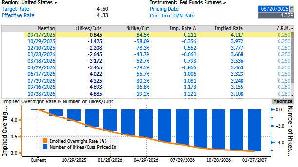 The Federal Reserve's next policy meeting will be held on September 16-17. Interest rate swaps have odds at about 84.5% of a 25bps cut.