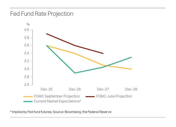 With the updated dot plot, the median projection is now for the Fed to trim rates to around 3.4 percent by the end of next year. In contrast, implied Fed funds futures point to at least two, if not three, cuts next year, with rates likely to end 2026 closer to 3 percent.