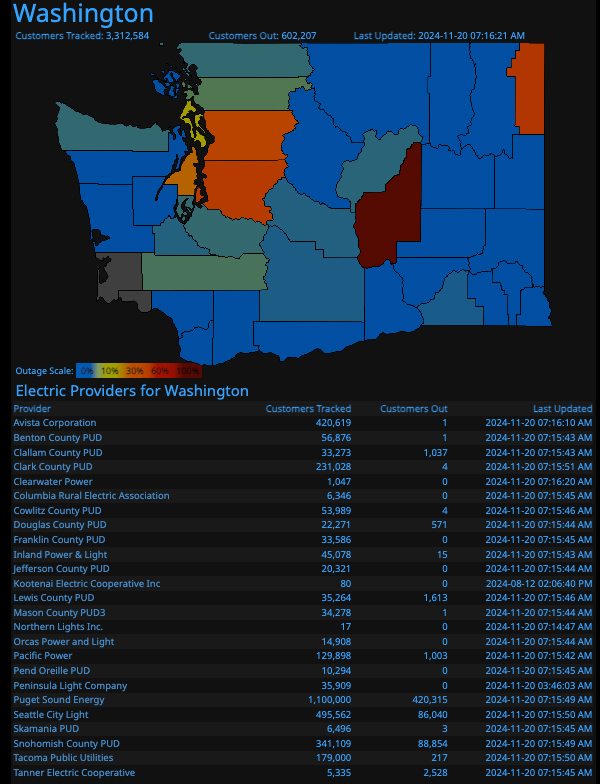 Early Wednesday, data from Poweroutage.US showed that over 600,000 power customers across Washington State had no power. The bulk of the outages were in King County and Snohomish County.