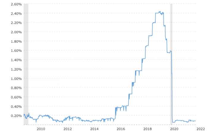 He’s certainly right about this. All the traditional “conservative” assets like savings accounts, CDs, money market funds, even government bond and corporate bonds (including junk bonds!) offer a negative yield after inflation. In the 13 years since the 2008 financial crisis, interest rates have been near zero for all but an all-too-brief stretch between. You can see the last decade or so on the chart below: Rates this low don’t make sense. Why lock in an after-inflation loss? Worse, there’s not much room for to offer a good return on investment, even when the next crisis hits.