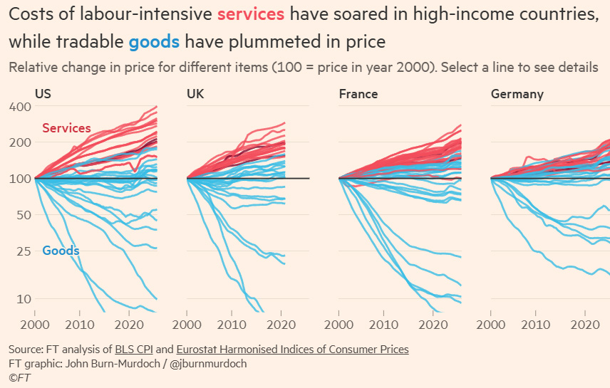 This sharp difference between goods and services is caused by the flood of cheap imports from China and other manufacturing powerhouses.